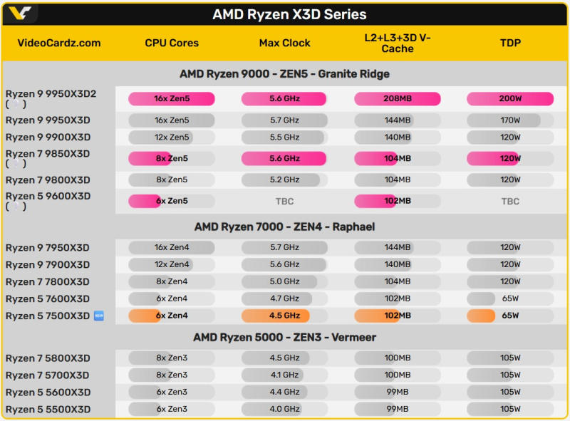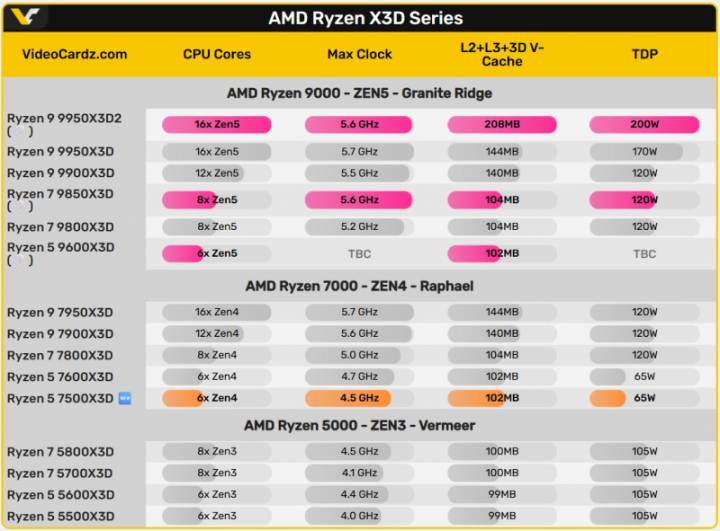 Також ходять чутки про розробку AMD більш потужного Ryzen 7 9850X3D (120 Вт, 8 ядер, 16 потоків, 96 МБ кешу L3, 5,6 ГГц / 4,7 ГГц), флагманського Ryzen 9 9950X3D2 (200 Вт, 16 ядер, 32 потоки, 192 МБ кешу L3, 5,6 ГГц / 4,3 ГГц) та початкового рівня Ryzen 5 7500X3D (65 Вт, 6 ядер, 12 потоків, 96 МБ кешу L3). Оскільки до виставки CES 2026 залишилося всього два місяці, можна очікувати, що AMD представить там деякі з цих процесорів, якщо не всі чотири.