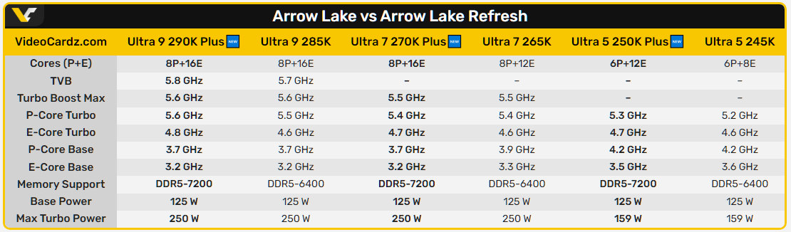 Нові чипи мають зберегти сокет LGA 1851 і сумісність із чипсетом Z890, пропонуючи вищі частоти, більшу кількість ядер у деяких сегментах та покращену підтримку пам'яті. Серія "Plus" включатиме флагманські моделі Ultra 9 290K+, Ultra 7 270K+ та Ultra 5 250K+. Усі моделі зберігають базовий тепловий пакет (TDP) на рівні 125 Вт, але, як очікується, демонструватимуть значний приріст продуктивності.
