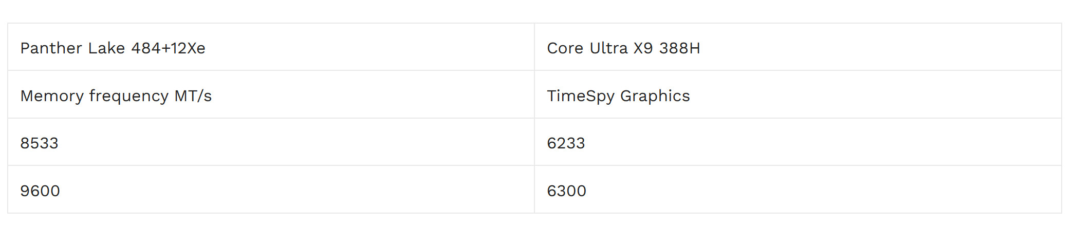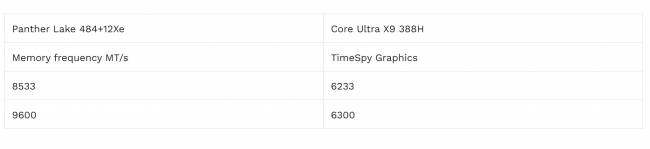 Дивовижні дані отримані з тестів 3DMark Time Spy, пов'язаних з флагманським Core Ultra X9 388H, який, як повідомляється, набирає близько 6233 балів з пам'яттю 8533 MT/s та приблизно 6300 балів зі швидшими модулями LPDDR5X 9600 MT/s. Порівняно з "Lunar Lake", найкращі конфігурації Panther Lake демонструють збільшення продуктивності майже на 33% у цих синтетичних тестах у порівнянні з інтегрованим графічним процесором Lunar Lake Arc 140V. Це порівняно з найвищими результатами інтегрованого графічного процесора Arc 140V у 3D Mark Time Spy з даними з бази даних Notebookcheck, де інтегрований графічний процесор Lunar Lake набрав 4721 бал.