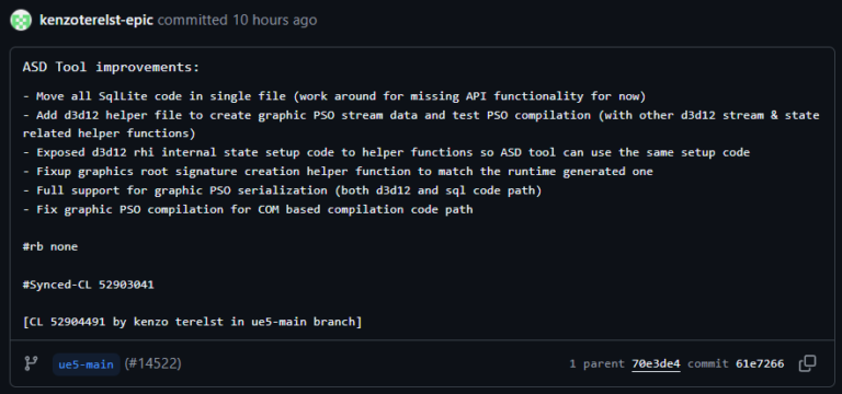 У коді гілки ue5main помічено коміт із позначкою «ASD Tool improvements», що стосується серіалізації Pipeline State Object, нового допоміжного коду для D3D12 та виправлення компіляції PSO.
