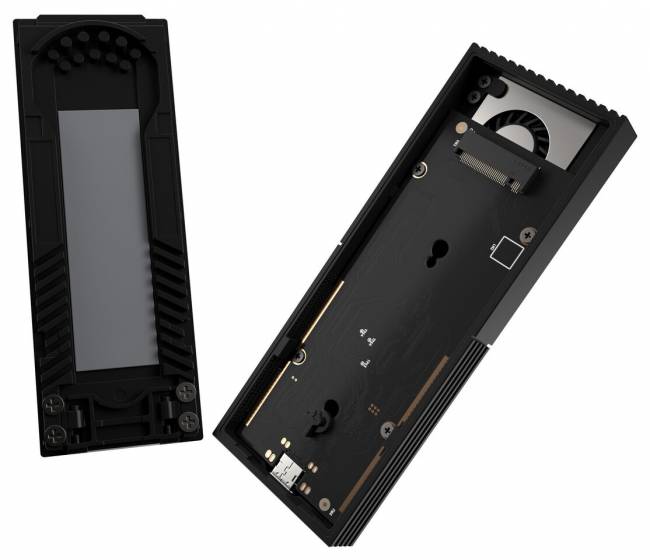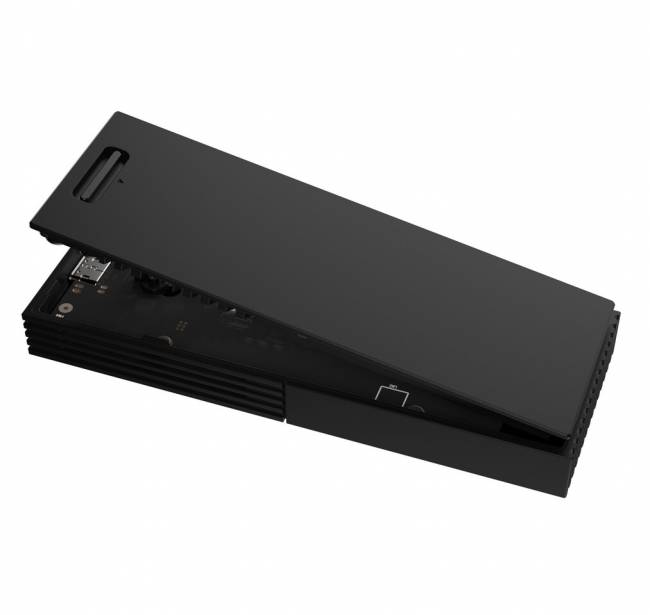 Корпус має компактні розміри 124,8 × 46,5 × 13,5 мм, вагу 127 г та виконаний у стилі Stealth Black. Завдяки push‑to‑open механізму SSD можна швидко встановити або замінити без інструментів. Інтерфейс USB4 через USB‑C забезпечує сумісність із USB 3.2 Gen 2, Gen 1 та USB 2.0, а підтримка Windows 10/11 та macOS 14.4 гарантує універсальність використання.