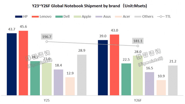 Очікується, що компанія продасть близько 28 мільйонів MacBook, тоді як у 2025 році цей показник становив приблизно 23 мільйони. Лідерами залишаються Lenovo з прогнозом у 43 мільйони та HP із 39 мільйонами.