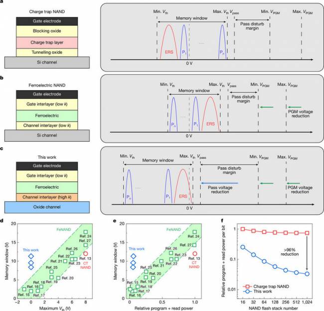 Сучасна NAND-флешпам'ять має високе енергоспоживання через необхідність подачі великих напруг 15–20 В для операцій запису та стирання. Нова архітектура радикально розв'язує цю проблему: замість традиційних плаваючих затворів використовуються сегнетоелектричні польові транзистори (FeFET) з діелектриком із легованого цирконієм оксиду гафнію (HfZrO) та каналом з оксидного напівпровідника (наприклад, IGZO). Це дало змогу знизити робочу напругу до наднизьких значень 4–6 В, що значно зменшило енергоспоживання.
