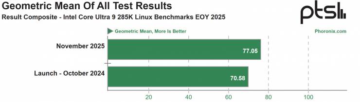 Видання Phoronix провело тести у Linux і виявило, що високопродуктивний Intel Core Ultra 9 285K показав помітне покращення продуктивності приблизно на 9%. Що особливо важливо, цей приріст досягнуто при використанні лише 85% енергії, яку процесор споживав рік тому, що становить зниження на 15%. Це свідчить про успішну оптимізацію програмного забезпечення, спрямовану не лише на зменшення енергоспоживання та тепловиділення, але й на вилучення додаткової продуктивності з самого кремнію "Arrow Lake-S".