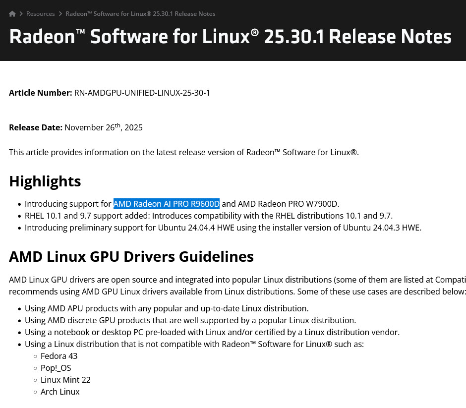 AMD готує до випуску два нових професійних графічних процесори, Radeon AI Pro R9700S та Radeon AI Pro R9600D. Вони будуть побудовані на базі наявної моделі Radeon AI Pro R9700, випущеної наприкінці жовтня. Згадки про R9600D вже з'явилися у драйвері AMD 25.30.1 для Linux, а анонс обох карт очікується приблизно на CES 2026.