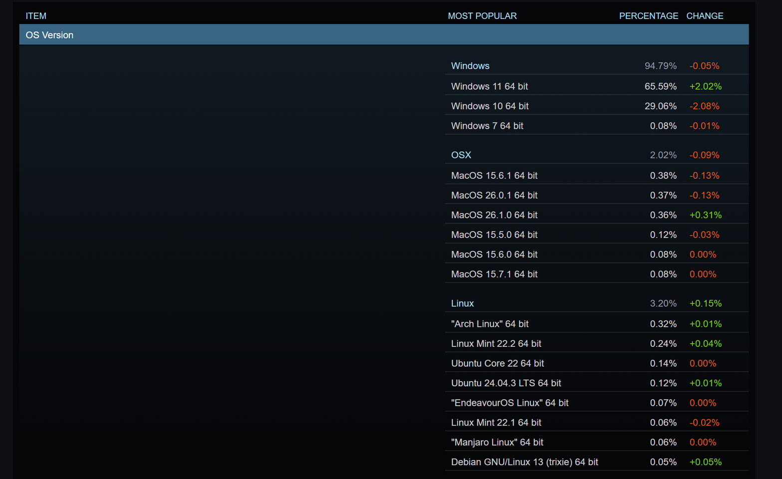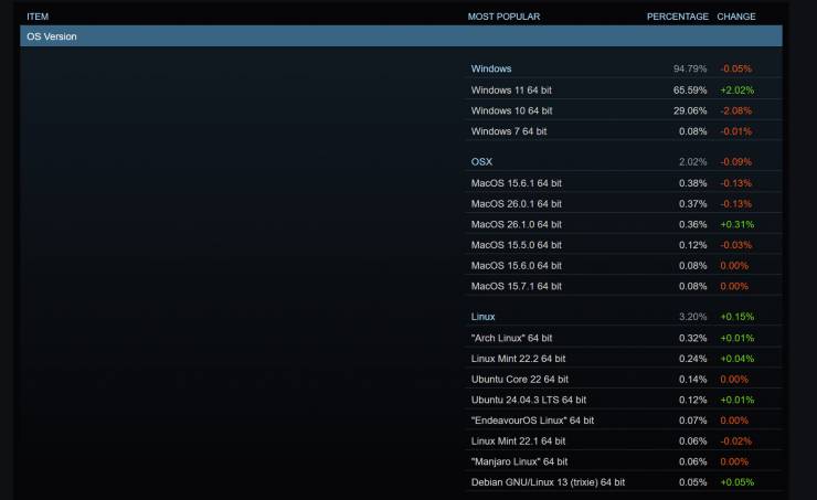 Цікавим є помітне зростання використання Linux, яке досягло найвищої в історії частки у 3,20% (+0,15%). Це може бути пов'язано з кількома факторами: переходом деяких користувачів Windows 10 на Linux-системи, або зростанням популярності портативних пристроїв, таких як Steam Deck, що працює на базі Linux (SteamOS).