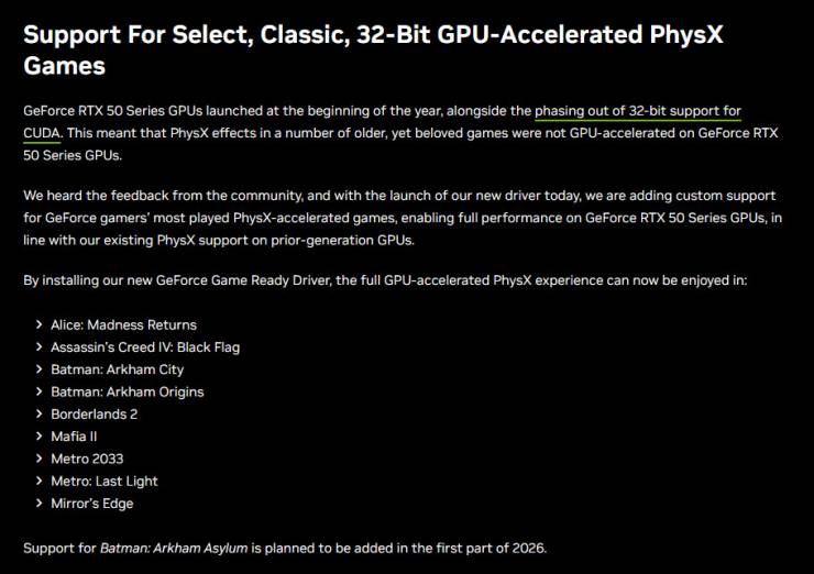 Водночас компанія розв'язала проблему сумісності, розширивши підтримку застарілих 32-бітних ефектів PhysX на відеокартах серії GeForce RTX 50, відновлюючи функціональність кількох старих класичних ігор для ПК, включаючи Alice: Madness Returns, Batman: Arkham City та Borderlands 2.