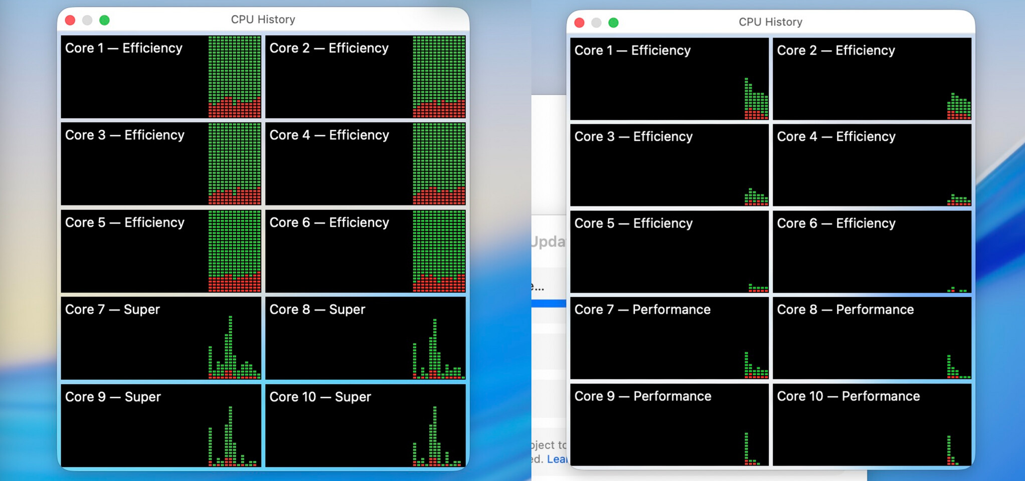 На скріншотах, наданих Ars Technica, видно, як нова система позначень відображається у порівнянні зі старою. У звичайному M5 продуктивні ядра тепер називаються «Super Core», а ефективні ядра залишилися без змін.