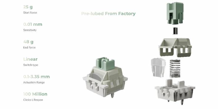 Перемикачі Lime мають легке зусилля спрацьовування 25 г, хід 3,35 мм та повністю POM‑конструкцію. Серед особливостей — «ергономічна похила клавіша пробілу», розроблена відповідно до природного вигину пальців, та вбудована силіконова підставка для рук.