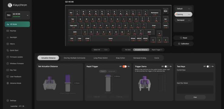 Оновлений контролер тепер забезпечує надвисоку частоту опитування 8000 Гц, хоча заради зменшення затримки Keychron пожертвувала бездротовим підключенням, яке було доступне в попередній серії Q HE. Оновлені датчики в Q2 HE 8K також роблять клавіатуру сумісною з ширшим асортиментом магнітних перемикачів, а не обмежуються магнітними перемикачами Gateron Double-Rail, як попередні клавіатури Keychron HE.