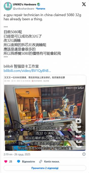 Проте китайські ентузіасти не забарилися з відповіддю: вони вже готують плани щодо самостійної заміни чіпів пам'яті для збільшення обсягу VRAM до 32 ГБ.