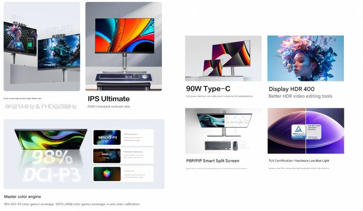 Монітор оснащений 27-дюймовою IPS-панеллю, яка забезпечує 100% охоплення sRGB, 98% DCI-P3, має коефіцієнт статичної контрастності 2000:1, а піковий рівень яскравості становить 450 ніт. Для геймерів передбачено підтримку технології Adaptive-Sync, що забезпечує сумісність з Nvidia G-Sync.
