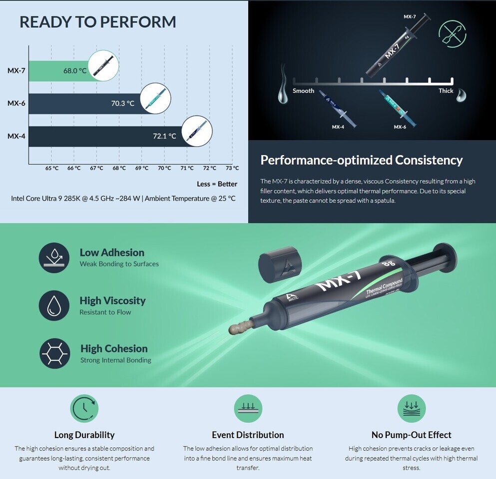 MX-7 позиціонується як паста, що забезпечує покращену теплопровідність порівняно з попередніми версіями, такими як MX-4 та MX-6. Це має забезпечити ще ефективніше відведення тепла від потужних CPU та GPU, що особливо важливо для розігнаних систем та високопродуктивних робочих станцій.