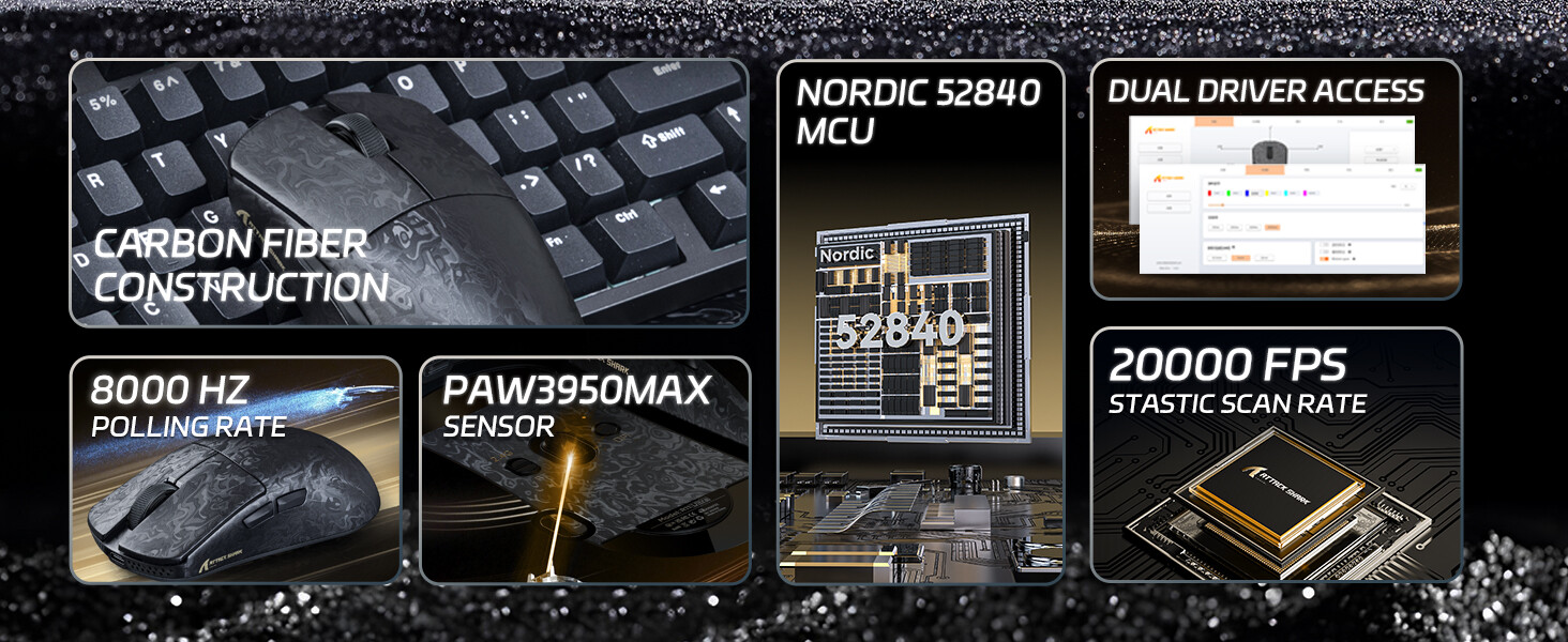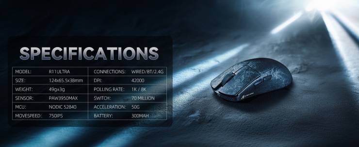 В основі R11 ULTRA лежить провідне в галузі обладнання, спрямоване на максимальну швидкість та точність. Миша оснащена спеціальним флагманським сенсором PixArt PAW3950MAX, який пропонує роздільну здатність до 42 000 DPI, швидкість відстеження 750 IPS та прискорення 50G. Бездротова архітектура реалізована на базі двомодульного чипсета Nordic 52840, що забезпечує стабільне з'єднання. R11 ULTRA має надзвичайно чутливу частоту опитування 8000 Гц та статичну частоту сканування 20 000 FPS. Фірмовий режим «Hunting Shark Mode» додатково підвищує чутливість відстеження. Перемикачі — оптичні Omron, розраховані на 70 мільйонів кліків, а енкодер F-Switch має ресурс 2 мільйони циклів. Двошарові ніжки забезпечують плавне ковзання.