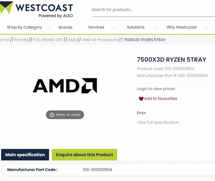 Видається, що AMD готується випустити свій найбюджетніший процесор з технологією 3D V-Cache. Новий Ryzen 5 7500X3D був непомітно помічений у базі даних британського роздрібного продавця Westcoast UK, що є сильним натяком на його майбутній реліз.