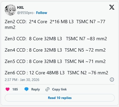 За попередніми даними, розмір кристала Zen 6 складе приблизно 76 мм², що лише трохи більше за показник Zen 5 (71 мм²). Такої щільності вдасться досягти завдяки переходу на технологічний процес TSMC N2 (2 нм).