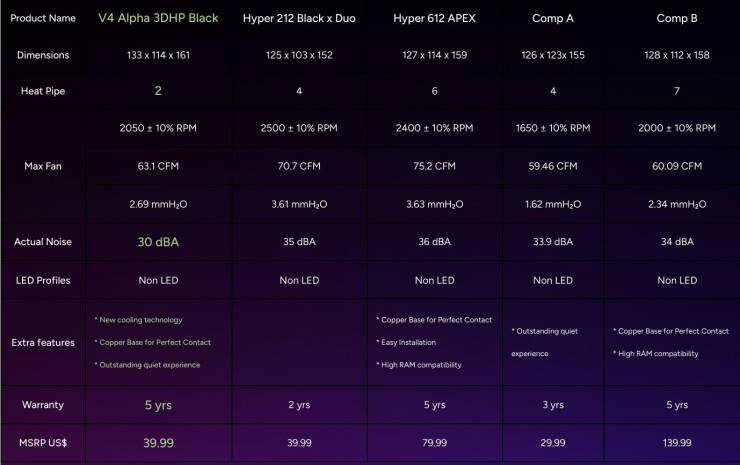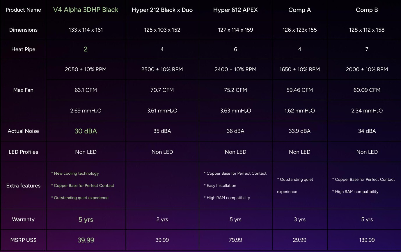 Як найновіший продукт у рамках кампанії Thermal Excellence, V4 Alpha поєднує запатентовану технологію Cooler Master 3DHP з мінімалістичним формфактором з однією баштою.