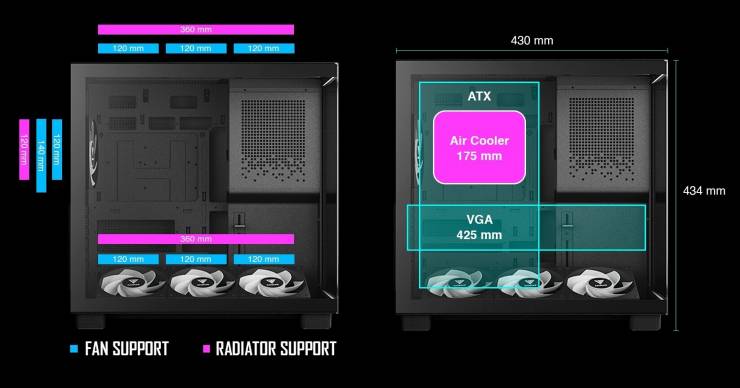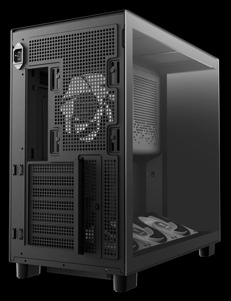 Головною особливістю новинки є панорамний огляд внутрішніх компонентів знизу доверху завдяки безшовним панелям із загартованого скла спереду та збоку. Щоб усунути візуальні бар'єри, вона перенесла блок живлення у передню частину корпусу, розвернувши його роз'ємами вниз для зручнішого кабельменеджменту. Така конструкція не лише відкриває безперешкодний вид на систему, але й дозволяє ефективніше використовувати простір для встановлення потужних компонентів, включаючи відеокарти довжиною до 425 мм.