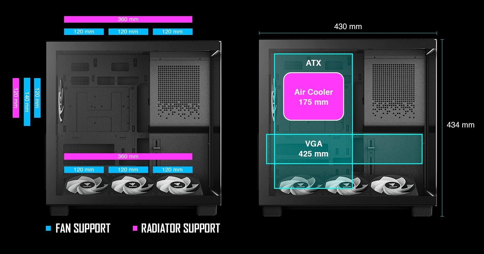 Gamdias оснастила корпус унікальною регульованою системою нижніх вентиляторів, які можна встановлювати під шістьма різними кутами для точного спрямування потоку на графічний процесор. У комплекті постачаються чотири тихі 120-мм вентилятори NOTUS M1 ARGB, якими керує вбудований 8-портовий концентратор із підтримкою ШІМ та синхронізацією підсвічування.