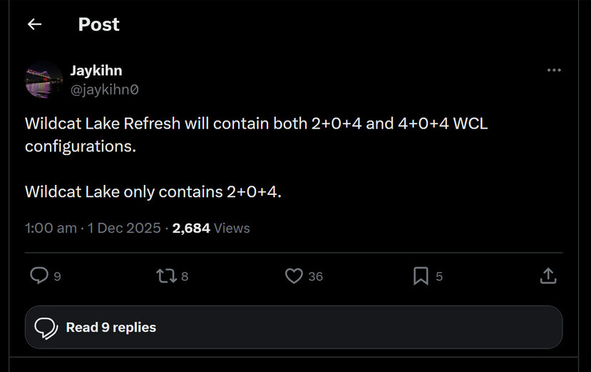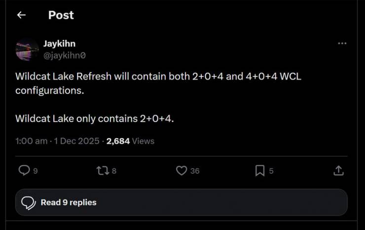 Джейкін окреслив дві конфігурації ядер «Wildcat Lake Refresh» — «2+0+4 та 4+0+4» — із загальним чиплетним дизайном. Це означає, що Intel працює над моделями з 4 або 6 основними ядрами. Липневі чутки також вказували на роботу над 6-ядерним процесором, доповненим інтегрованим графічним процесором (з двома ядрами Xe) на базі архітектури Arc Xe3 «Celestial».