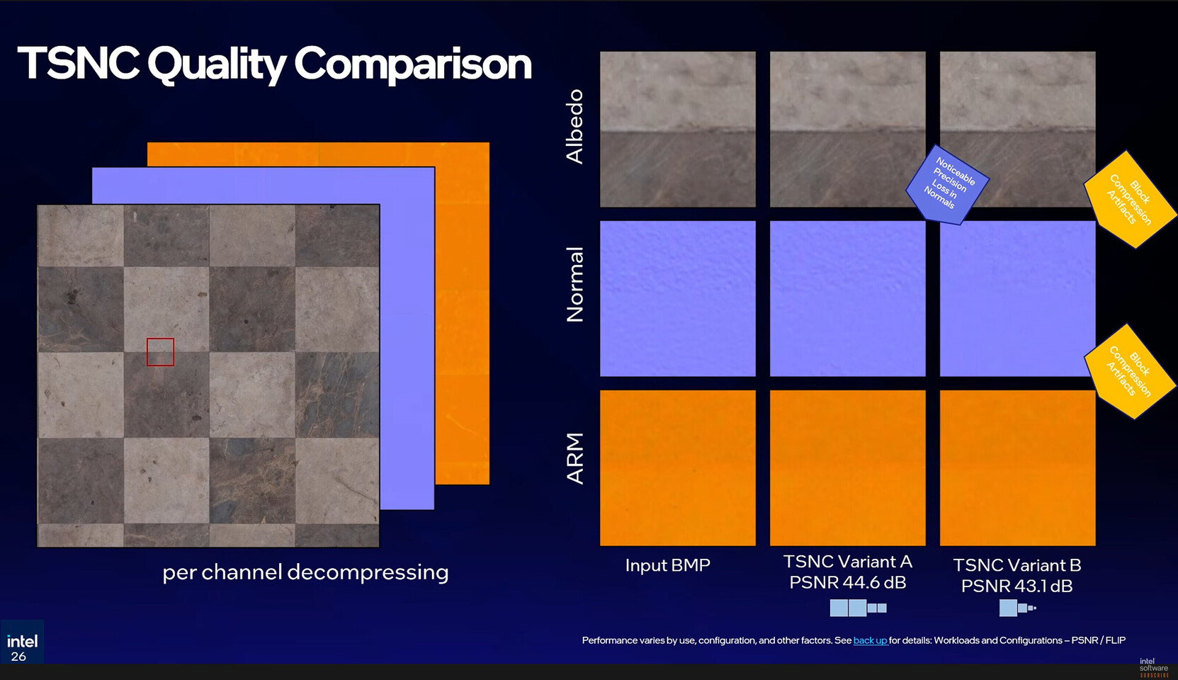 TSNC має два режими використання. Варіант A стискає текстури приблизно у 9 разів із падінням якості лише на 5% — майже непомітним для ока. Варіант B забезпечує максимальне стиснення до 18 разів, але з втратою якості до 7%, що вже трохи помітніше. Для вимірювання різниці Intel використала інструмент FLIP від NVIDIA.