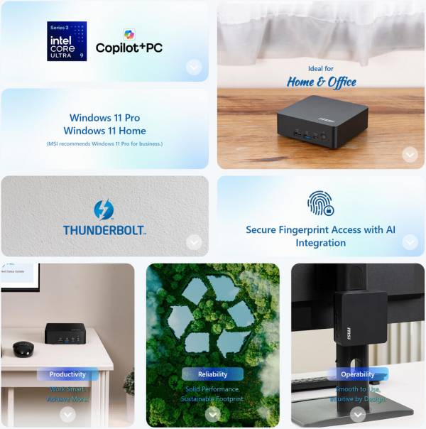 Cubi NUC AI+ 3MG оснащений двома портами Thunderbolt 4, які підтримують до чотирьох дисплеїв одночасно, а також двома Ethernet 2.5G для швидкої та безпечної мережі. Система має кнопку живлення з розпізнаванням відбитків пальців, корпус без інструментів для легкого обслуговування та органайзер кабелів для надійності у кіосках чи компактних робочих місцях.