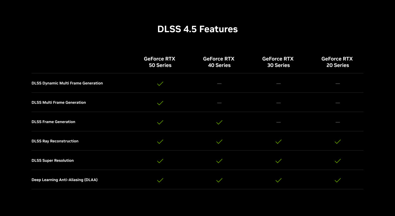 Функції доступні лише на відеокартах GeForce RTX 50 серії Blackwell, де перехід від 4x до 6x Multi Frame Generation забезпечує до 35% приросту FPS у 4K з трасуванням шляху. DLSS 4.5 Super Resolution, заснований на другому поколінні Transformer‑моделі, вже працює у понад 400 іграх, але він покращує лише якість зображення без приросту продуктивності.