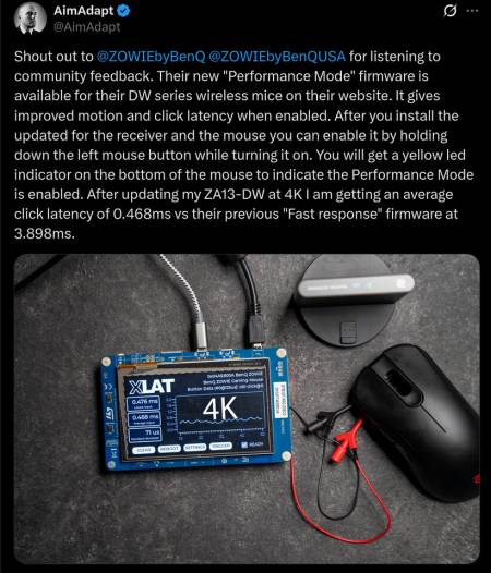 Оглядач периферії AimAdept перевірив прошивку на моделі Zowie ZA13-DW у режимі опитування 4 кГц за допомогою тестера затримки Xlat. Він зафіксував затримку кліку на рівні 0,468 мс, тоді як попередня версія з режимом "Швидка відповідь" показувала 3,898 мс. Це означає зниження більш ніж на 3 мс. Хоча у реальних ігрових умовах різниця може бути не настільки відчутною, користувачі тепер можуть бути впевнені, що промахи у грі не пов’язані з апаратними обмеженнями миші.