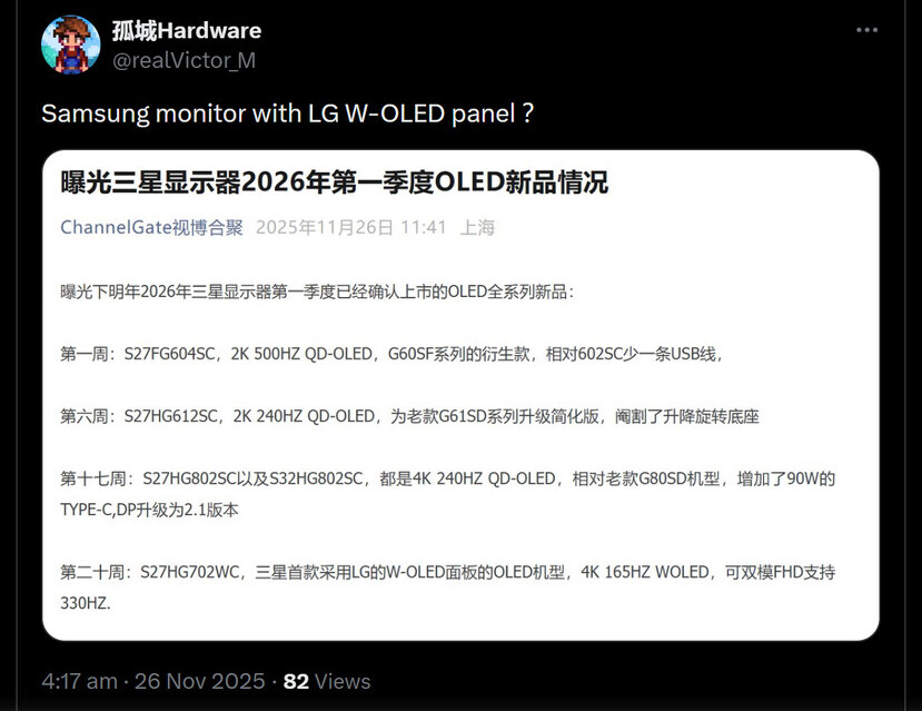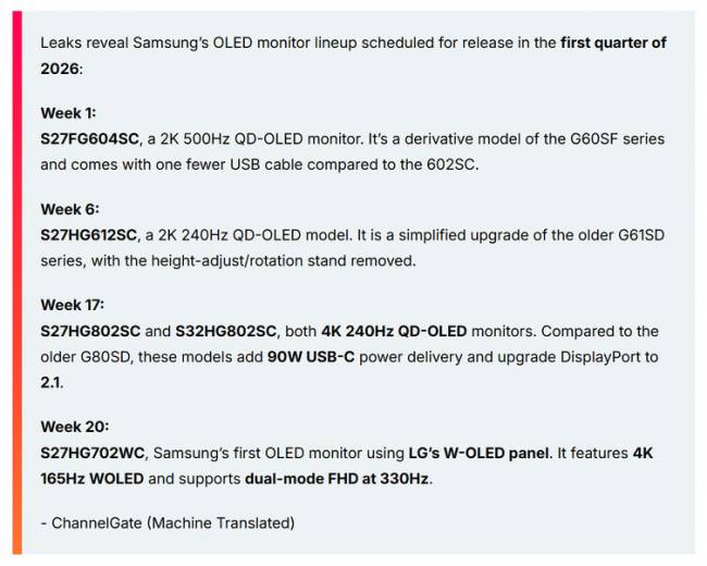 Деяка кількість телевізорів Samsung вже використовує технологію LG WOLED, але ця угода про постачання, виглядає, поширилася на ігрові лінійки. Галузеві експерти стверджують, що Samsung цілком здатна виробляти власні WOLED-рішення, але економічно вигідніше закуповувати пристрої у найближчого конкурента. Крім того, витік інформації з Channel Gate вказує на різні майбутні моделі на базі QD-OLED; здебільшого це оновлення наявних продуктів G60/61 та G80/G81. Запуск цих продуктів заплановано на першу половину 2026 року.