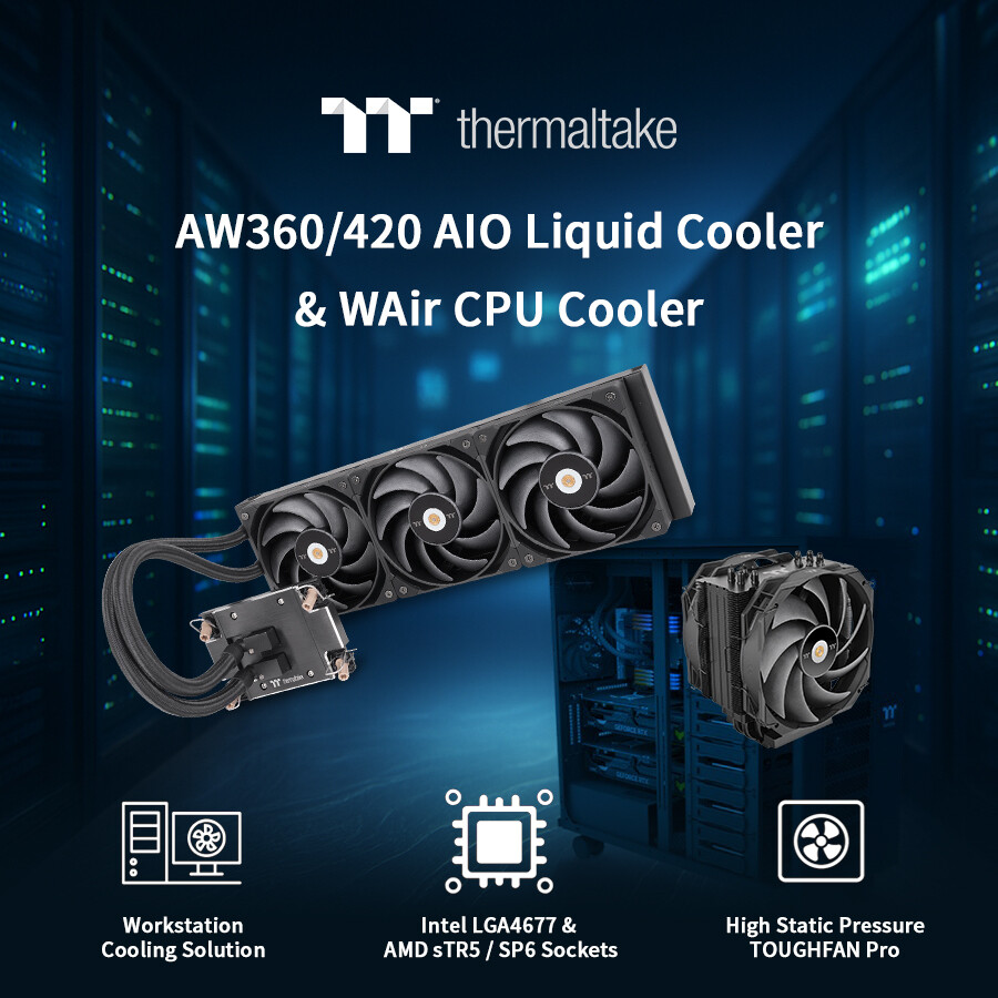 Рідинний кулер Thermaltake AW360/420 AIO та кулер для процесора WAir встановлюють новий стандарт для рішень для охолодження робочих станцій, поєднуючи промислові матеріали, вдосконалений дизайн та сумісність зі спеціалізованими роз'ємами робочих станцій.