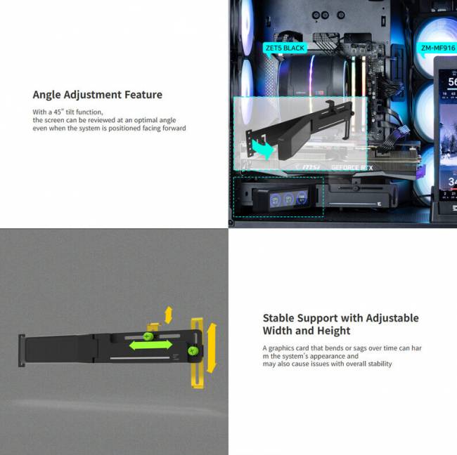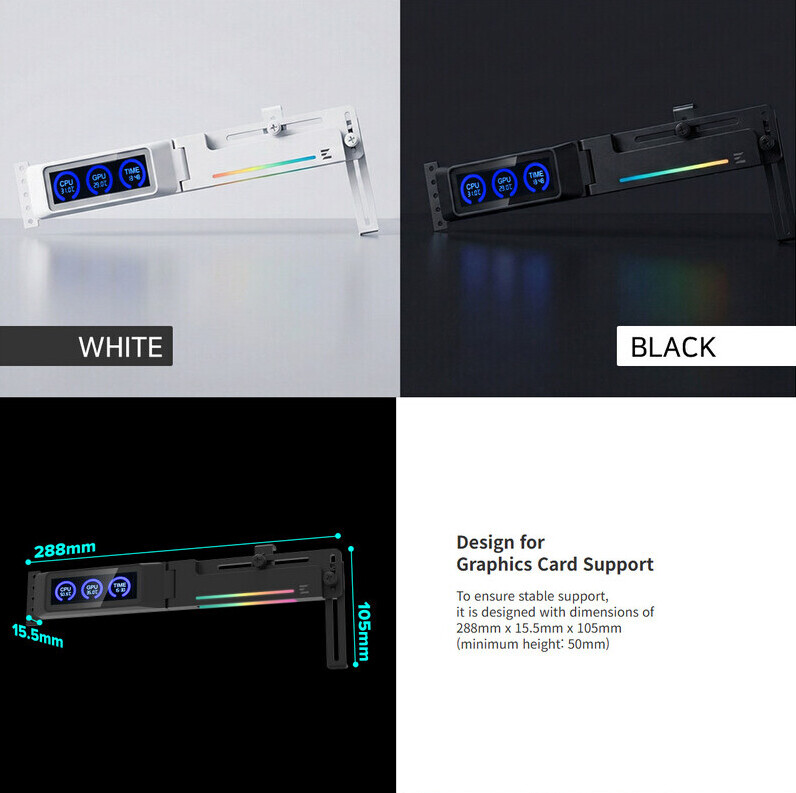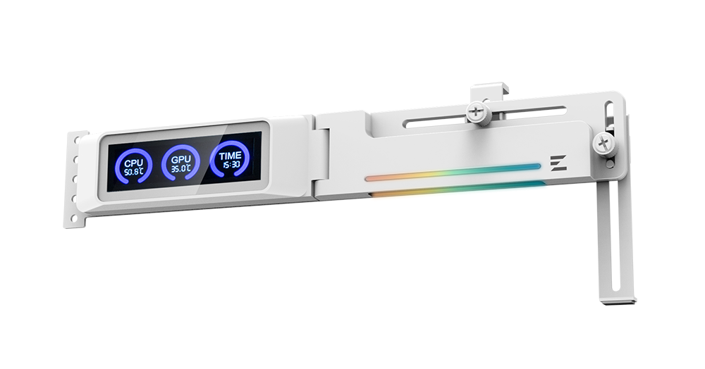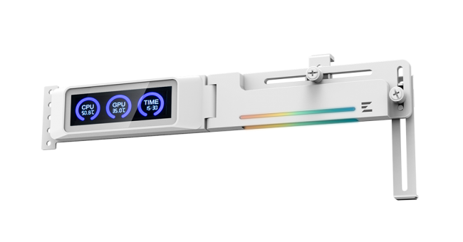 Нова модель ZM-VS3 DS представлена у чорному та білому кольорах, пропонуючи не просто захист від провисання плати, а й додатковий функціонал. Замість звичного надмірного ARGB-підсвічування, Zalman оснастила вертикальні підставки невеликими РК-екранами. Вони дозволяють користувачам відстежувати температуру процесора, відеокарти та поточний час у реальному часі, що робить моніторинг системи зручнішим та естетичнішим.