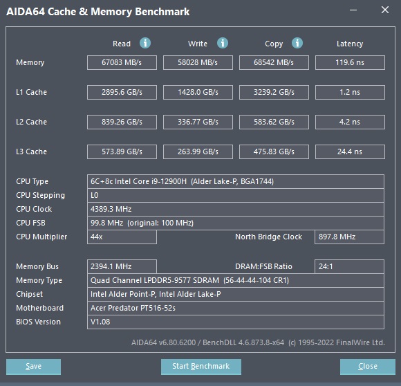 Підсистема оперативної пам'яті представлена розпаяними на материнській платі 32 ГБ DDR5-4800, які працюють у двоканальному режимі. Звичайно, латентність пам’яті не дуже гарна, проте у даному випадку вона не відіграє велику роль через гарні показники пропускної здатності та великий об’єм.