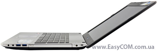 Грані ноутбука розділені на дві частини: верхня є частиною робочої панелі, а нижня належить до підстави, виконаної з чорного шорсткого пластику, і має плавне закруглення з країв, що позитивно позначається на зручності при перенесенні ASUS N56DP з місця на місце. Правда, так часто його носити не вийде, все-таки велика вага в 2,7 кг підносить певні обмеження.