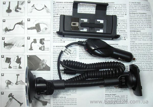 У комплекті присутній цілком стандартний за своєю конструкцією автомобільний тримач. За допомогою такої багатопозиційної «руки» можна закріпити навігатор до лобового скла автомобіля, використовуючи присоски на гнучкому штативі, а пластикова рамка надійно обхопить коммунікатор, не дозволяючи йому самостійно вийти із зачеплення. Тут саме присутній зарядний пристрій, що має живлення від бортової мережі 12 В. Всі ці елементи цілком порівнянні за своїми можливостями з іншими їх братами з подібних рішень інших виробників.