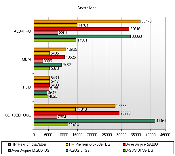 Тестування всіх ноутбуків проводили у двох режимах: максимальної продуктивності і максимальної економії батареї (BS) з відключенням у всіх варіантах бездротових елементів зв'язку, оскільки вони мають значне енергоспоживання. Однак, спеціального програмного забезпечення, відповідального за енергозбереження, від Hewlett-Packard на цьому ноутбуці не було встановлено. Швидше за все, всі ці функції були покладені на операційну систему Windows Vista, у якій є цілком якісна реалізація системи керування живленням ноутбука. Оперуючи тільки стандартними, реалізованими в самій операційній системі функціями енергозбереження, ми досягли цілком помітної різниці в результатах тестування.