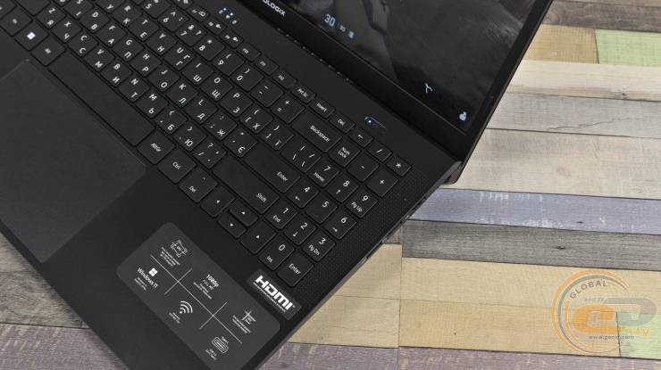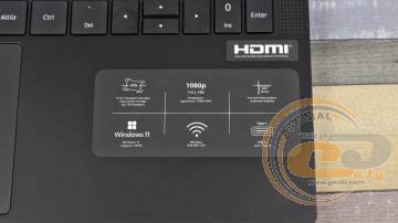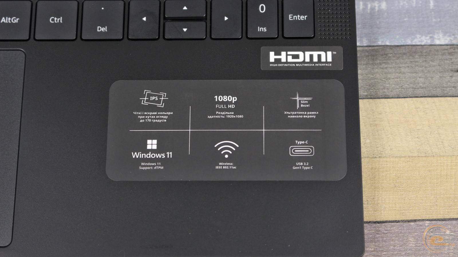 А з обох боків розміщені наліпки, які трохи розбавляють строгий вигляд ноутбука та інформують про його ключові характеристики.