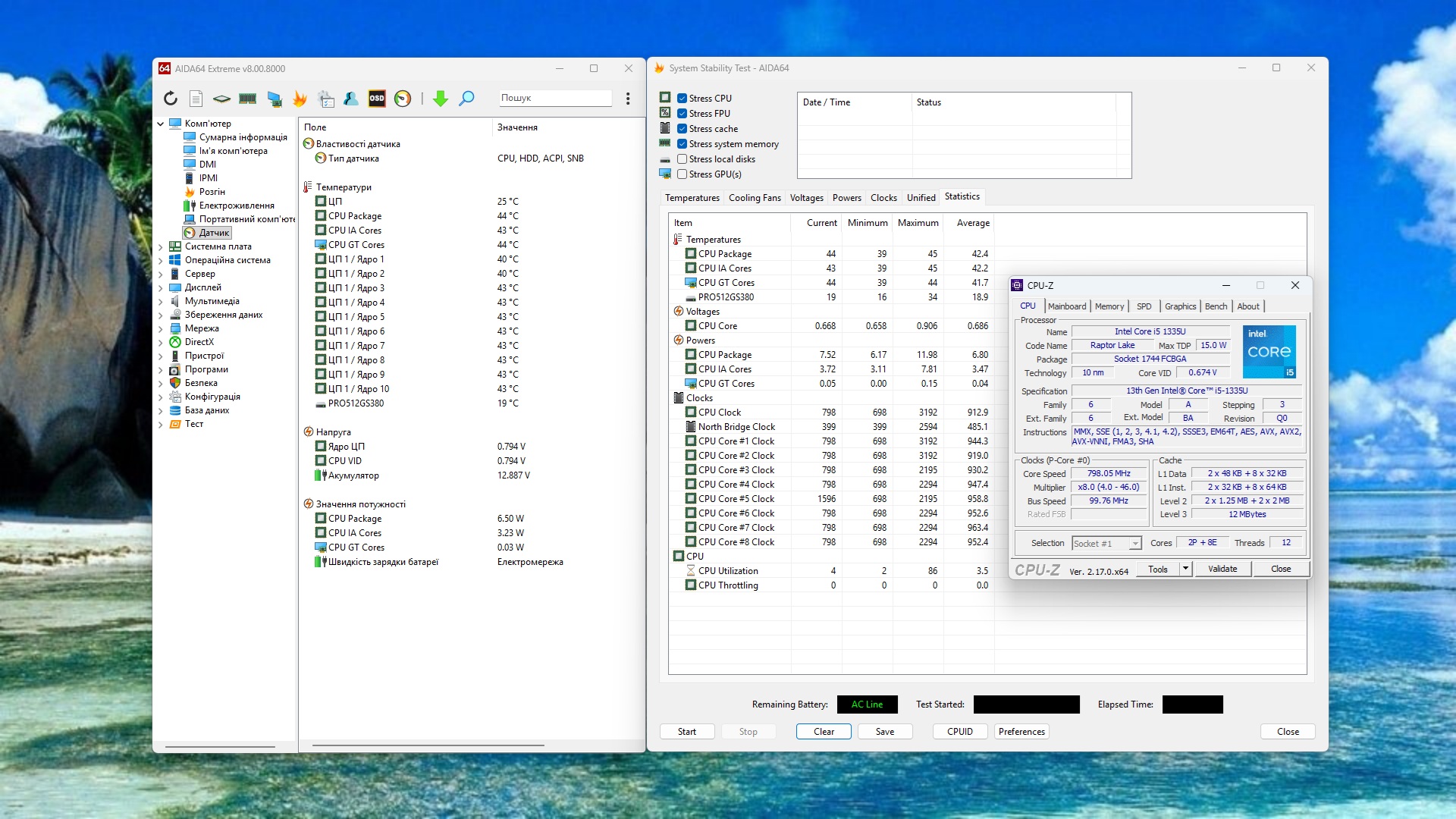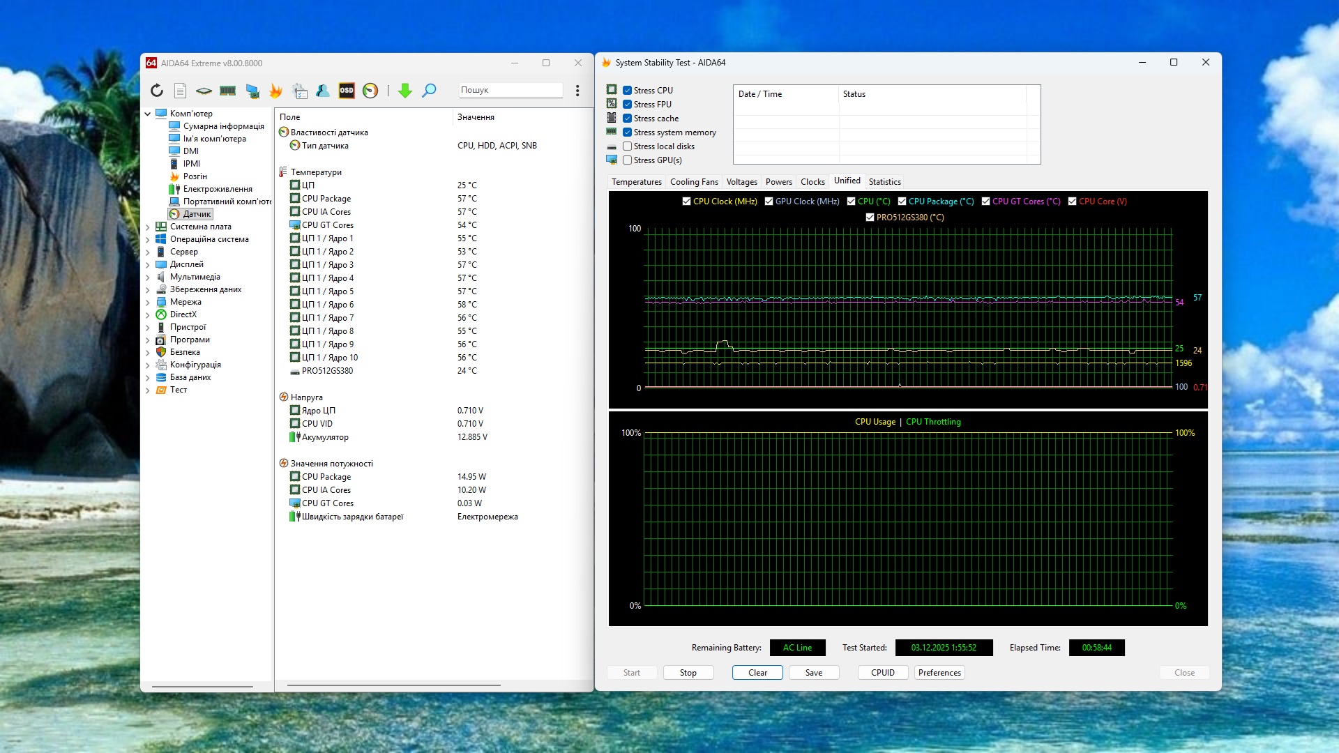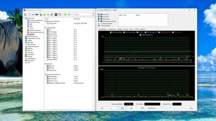 Під час практично годинного комплексного стрес-тесту AIDA64 температура ядер процесора не перевищувала 59°C, а шум вентилятора залишався нижчим за середній і цілком комфортним. Низьке нагрівання пояснюється вже згаданим обмеженням потужності процесора: частота продуктивних ядер знизилася до 1,6 ГГц, а енергоефективних — до 1,2 ГГц. Корпус при цьому залишався прохолодним, нагріваючись максимум до 38 °C.
