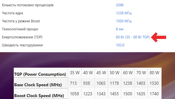 Сам же чіп працює на частоті 1237 МГц та може буститися до 1500 МГц з TDP на рівні 60 Вт. Так, у мобільних відеокарт частота та, відповідно, продуктивність залежать від «зашитого» теплового пакету і, звісно, системи охолодження. Мінімальне енергоспоживання RTX 3050 Mobile може бути 40 Вт для найтонших і дуже мобільних рішень, а максимум 80 Вт для більш ігрових.