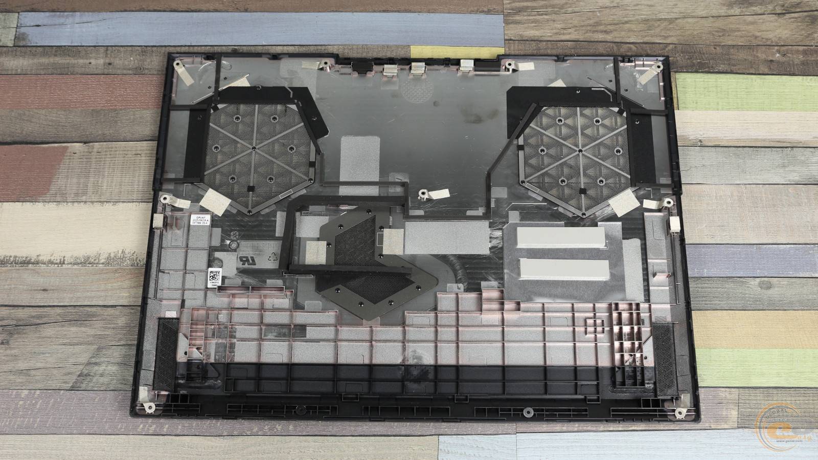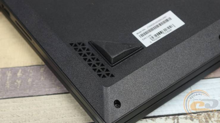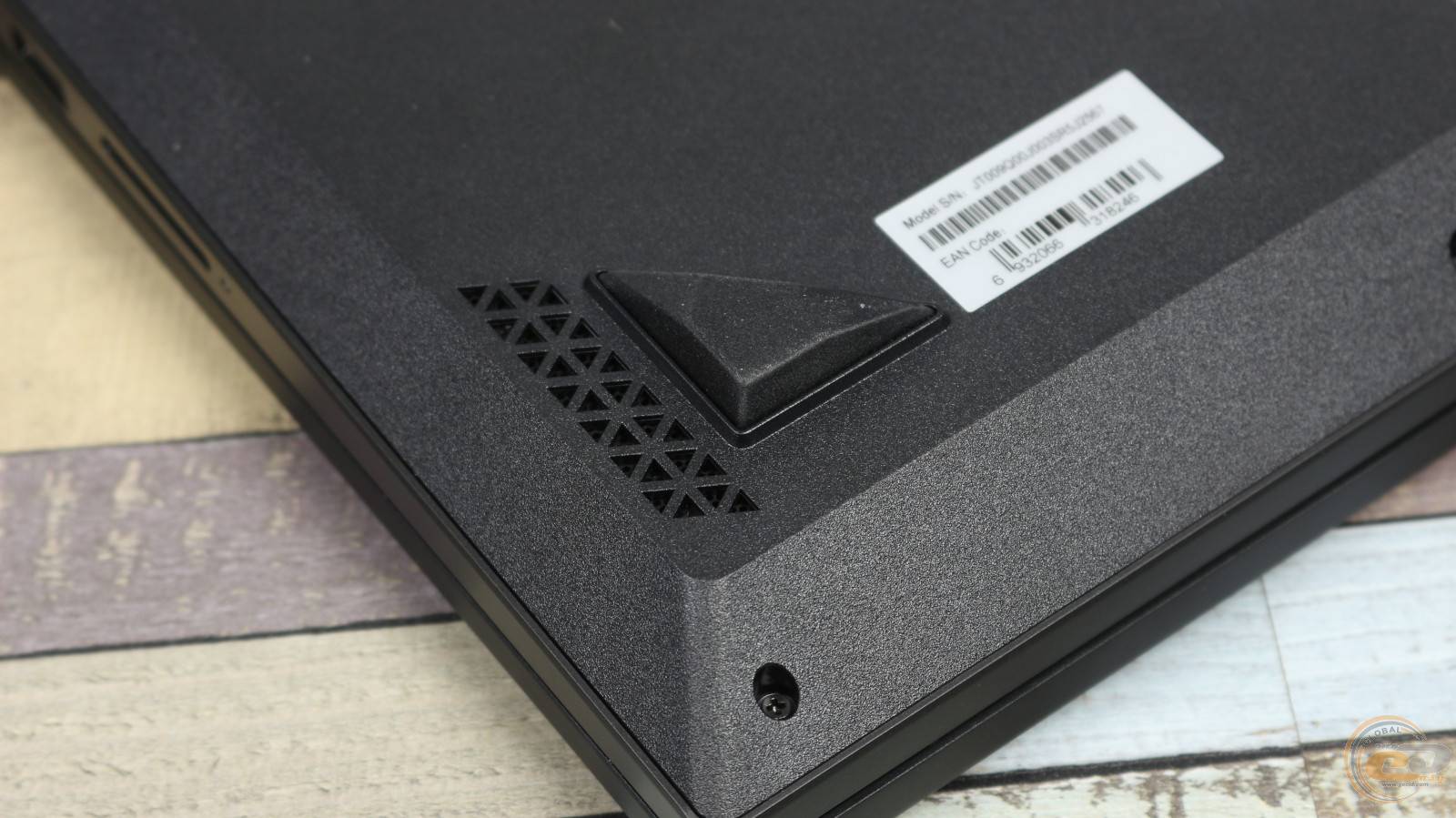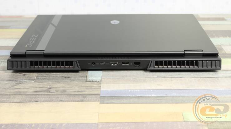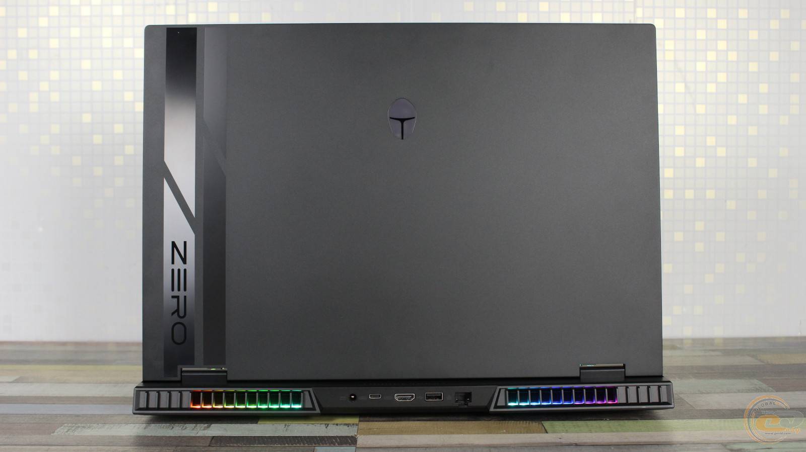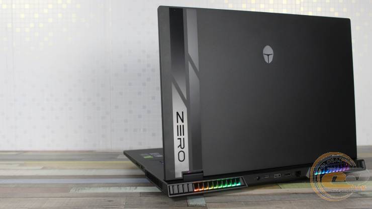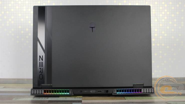 На тильній стороні ноутбука можна побачити масивні вирізи системи охолодження, які виробник оснастив яскравим підсвічуванням. За бажанням його можна налаштувати у фірмовому ПЗ.