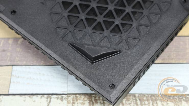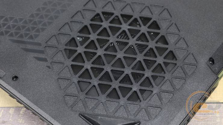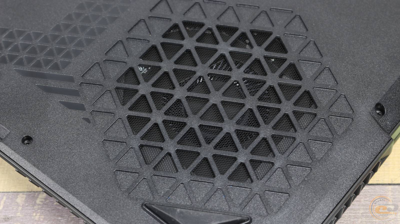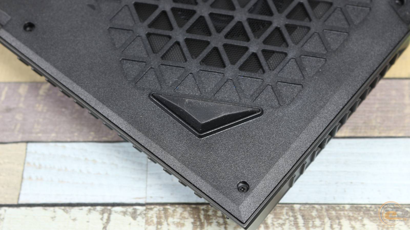На ній розміщені три великі перфоровані ділянки для системи охолодження, а також чотири середні гумові ніжки висотою 8 мм, що забезпечують надійне зчеплення з поверхнею.