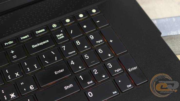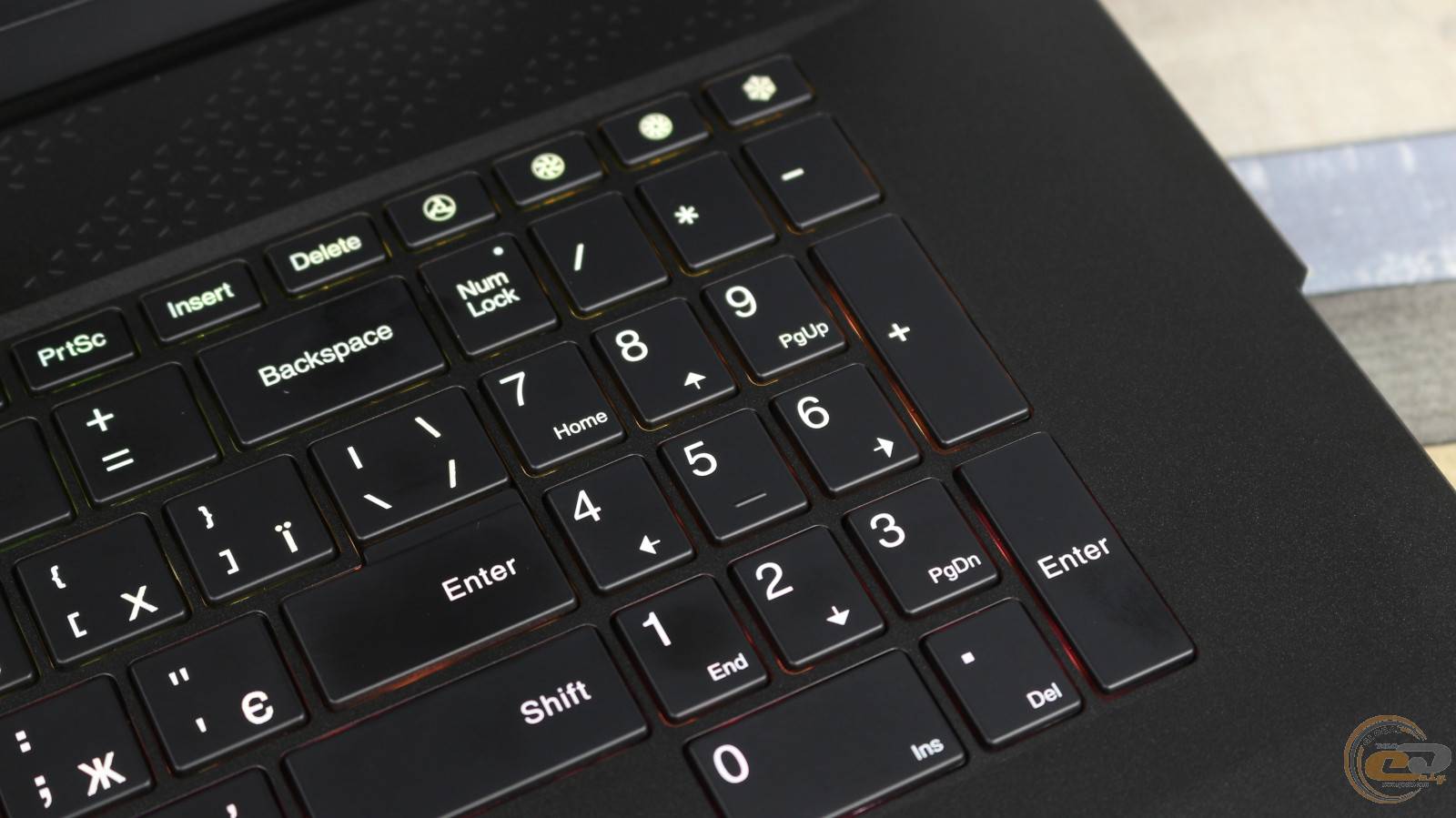 - клавіатура із окремим цифровим блоком і RGB-підсвічуванням, що має два рівні яскравості та можливість налаштування ілюмінації кожної клавіши;