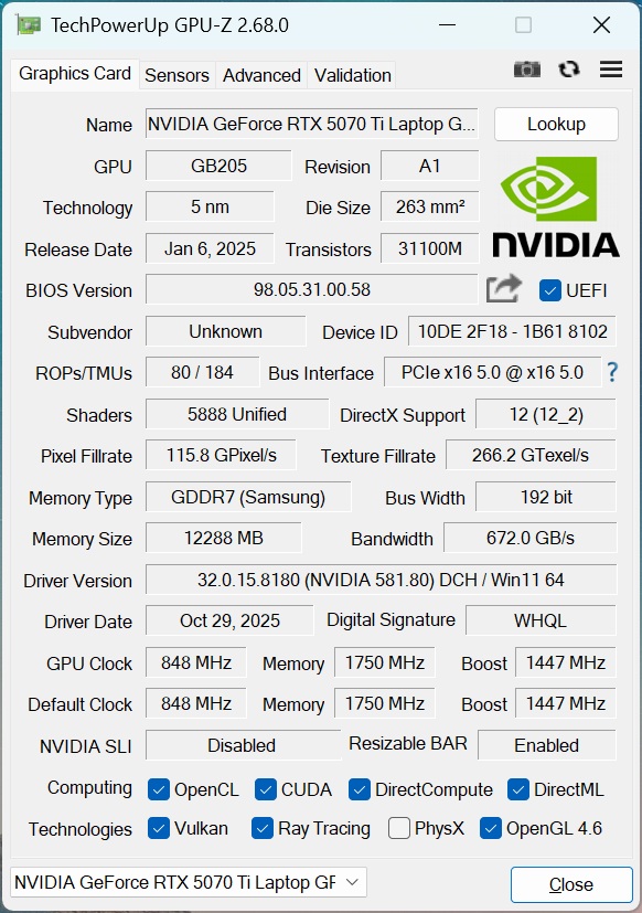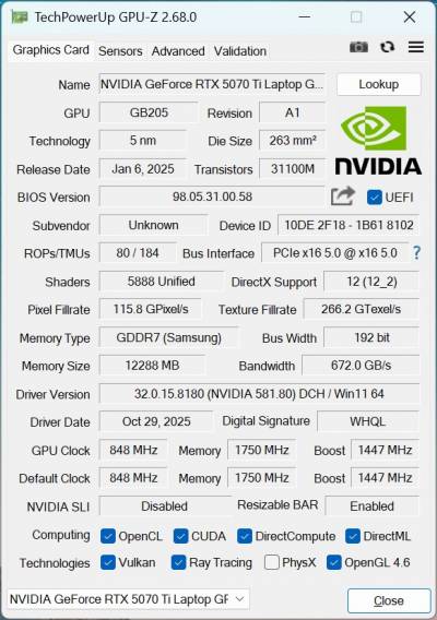 Мобільна NVIDIA GeForce RTX 5070 Ti (12 ГБ GDDR7, TGP 140 Вт, TDP 60 Вт) |