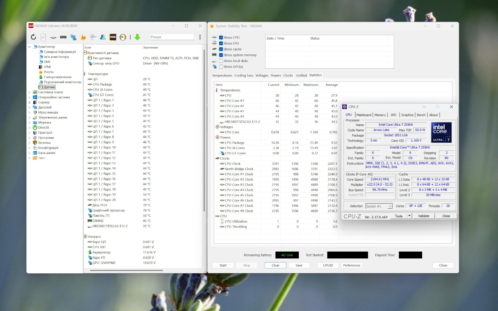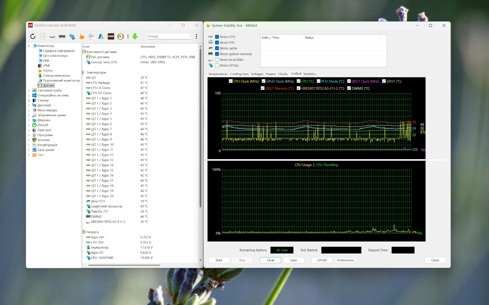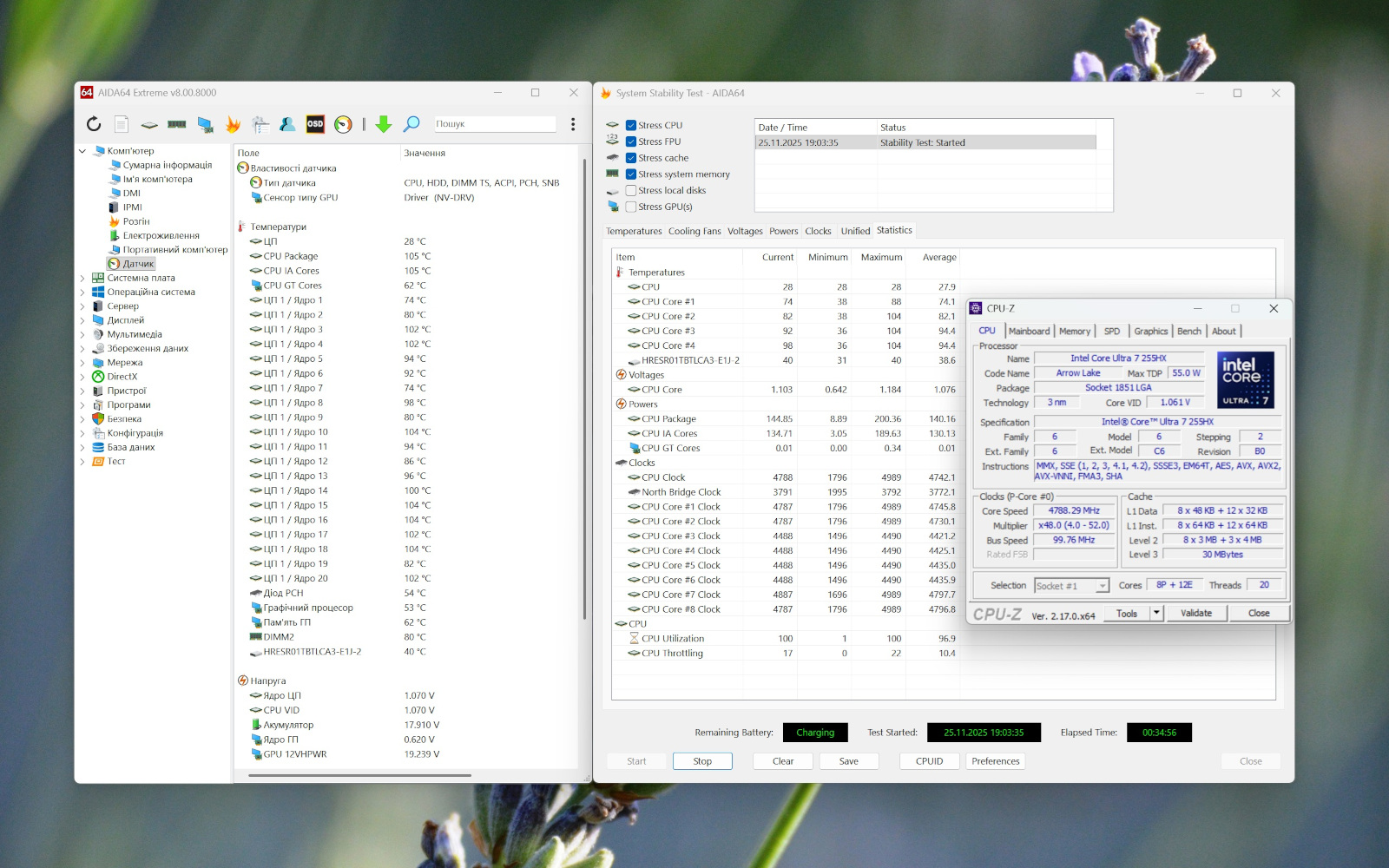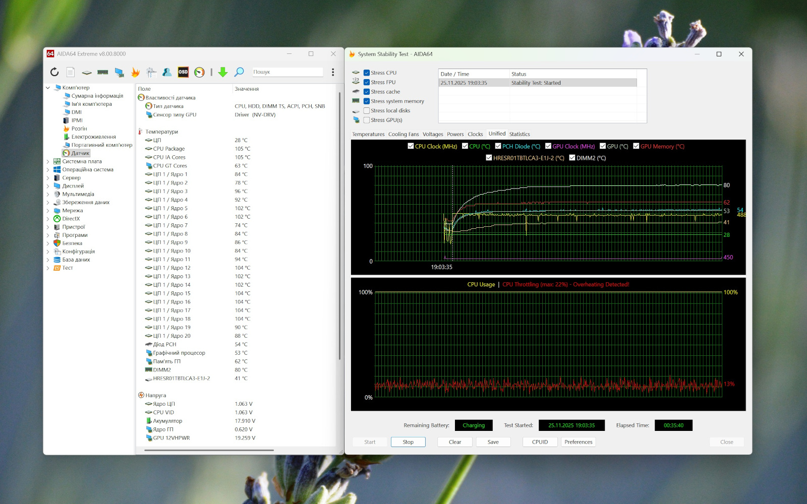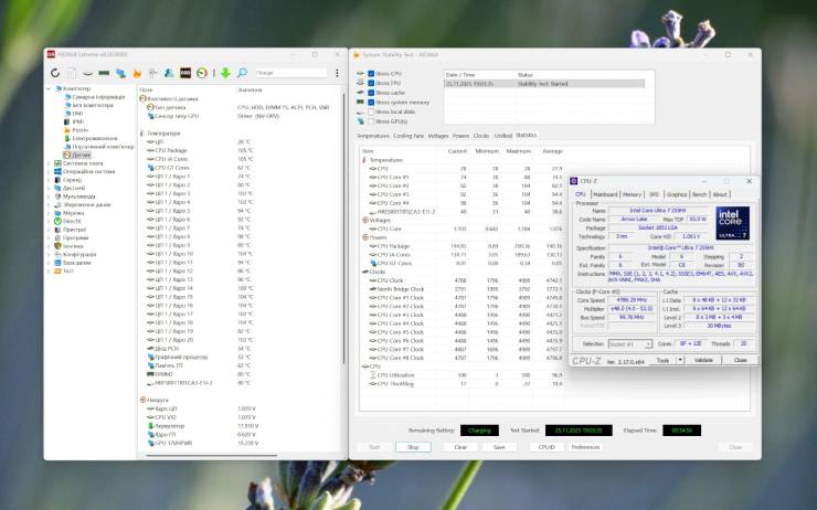 Стрес-тесту AIDA64 вдалося збільшити температуру процесора до 105°С. Частота його восьми високопродуктивних ядер при цьому залишалася досить високою та трималася на позначці у 4,8 ГГц. У такому режимі навантаження тротлінг процесора сягав 22%.