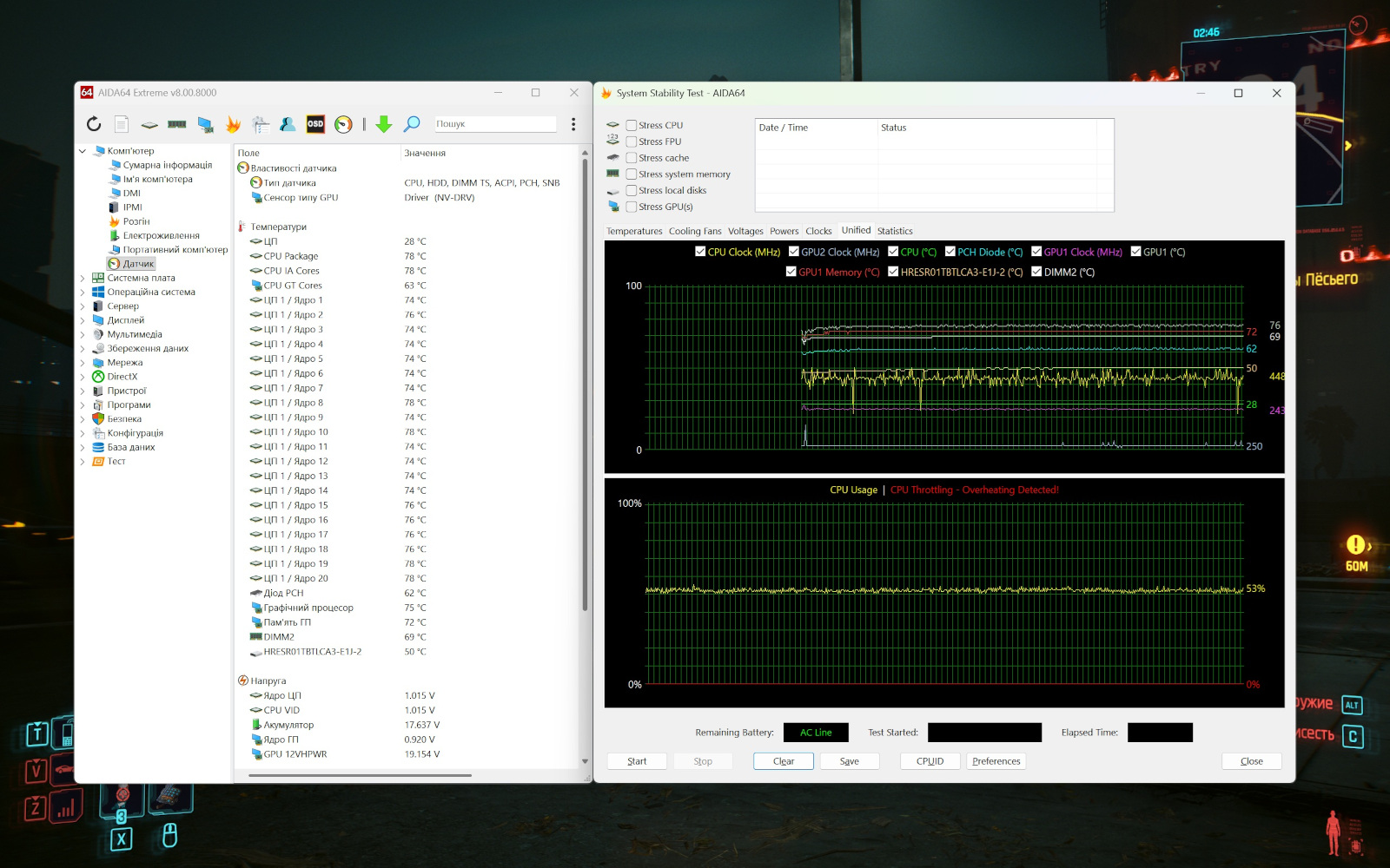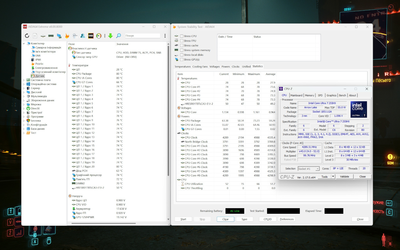 Максимальна температура процесора у ігровому проєкті Cyberpunk 2077 із пресетом налаштувань Ultra та роздільною здатністю 2560 × 1600 була відчутно меншою та досягала 80°С. Дискретна графіка, у свою чергу, прогрілась до 75°С.