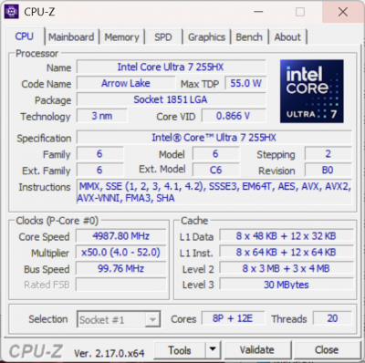Intel Core Ultra 7 255HX (20/20) (8 х 2.4 – 5.2 ГГц + 12 х 1.8 – 4.5 ГГц), 30 МБ L3, TDP 55 Вт) |