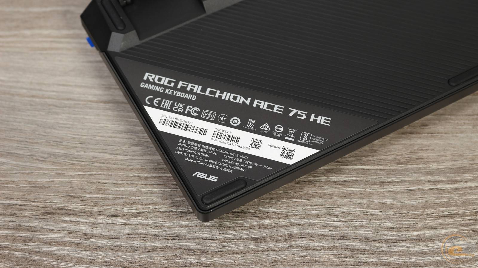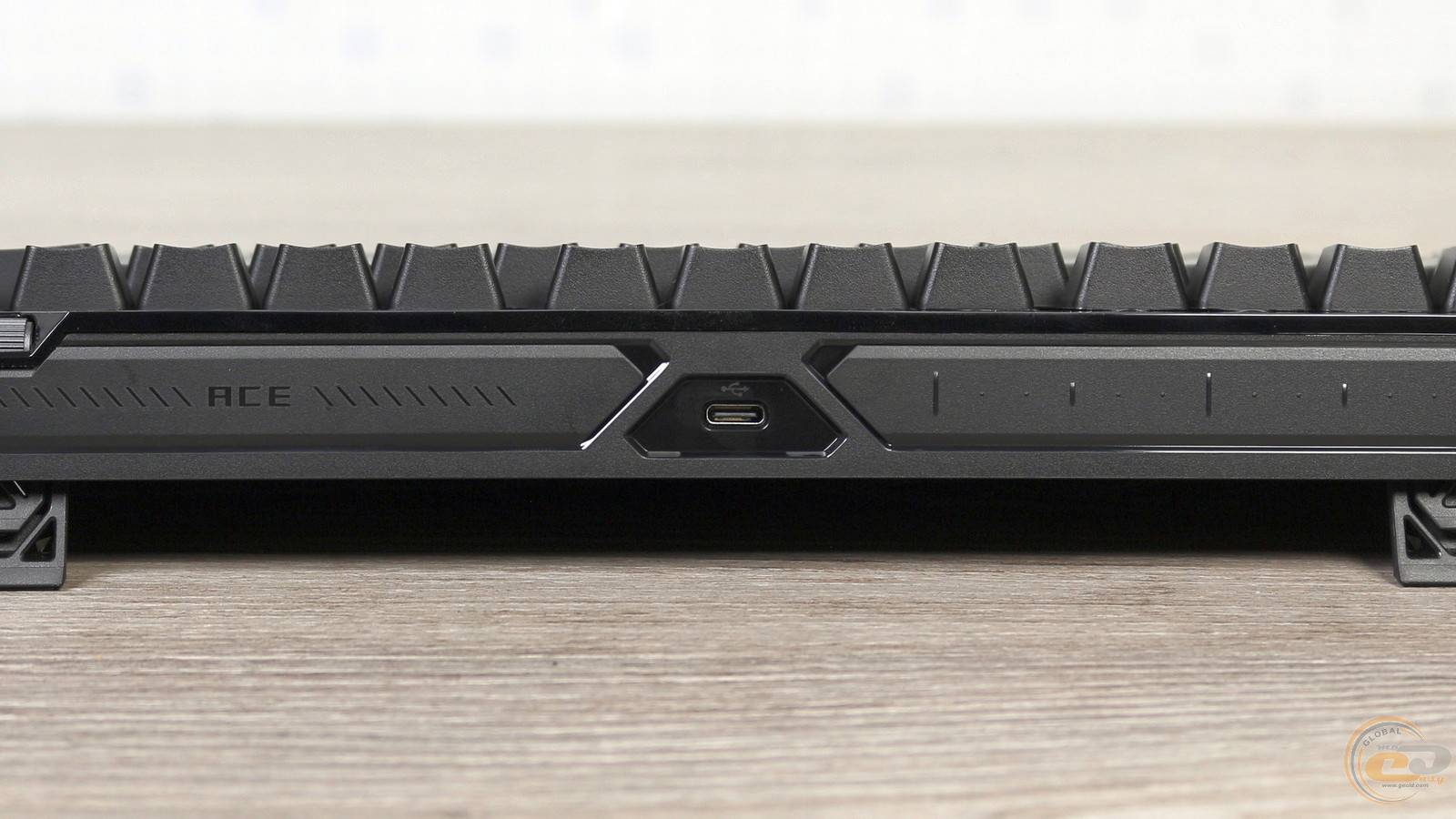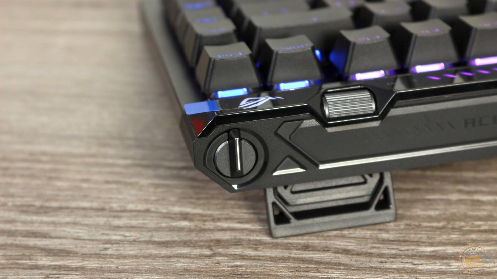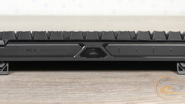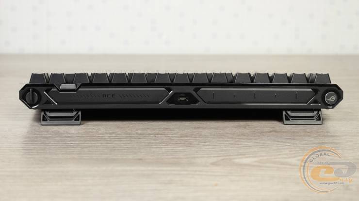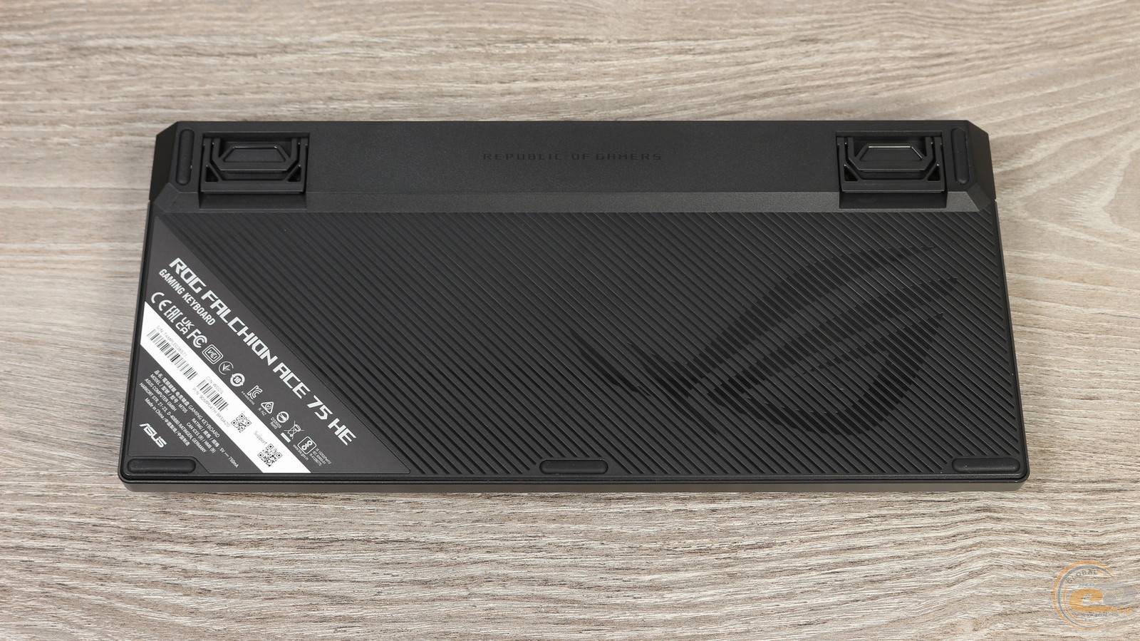 Нижня частина клавіатури виконана з чорного текстурованого пластику. Для стійкості на столі передбачено три гумові ніжки спереду та дві додаткові по кутах. Великий логотип ROG та напис “Republic of Gamers” підкреслює її брендову приналежність.