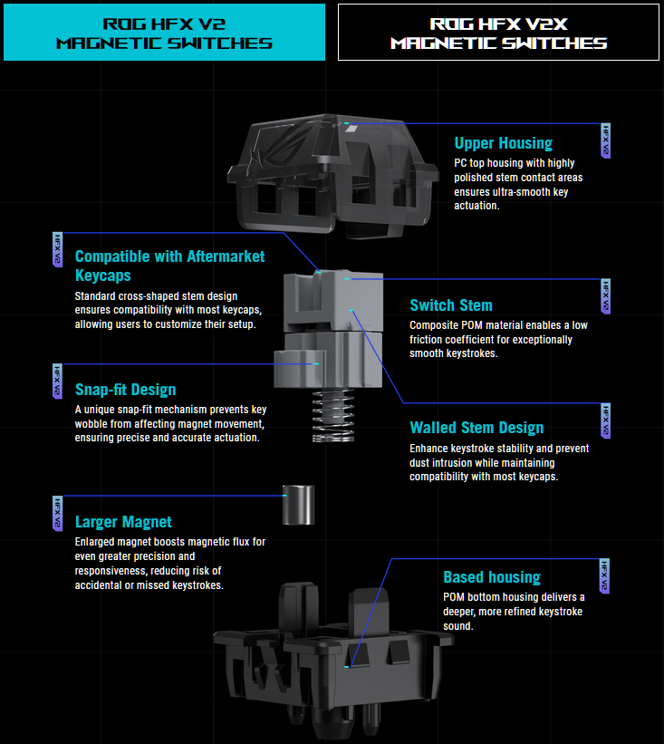 ROG HFX V2 — це лінійні магнітні перемикачі нового покоління, створені на базі сенсорів Hall Effect. Вони забезпечують безконтактне зчитування положення штока з точністю до 0,01 мм, дозволяючи налаштовувати точку спрацьовування в межах усього ходу — від 0,1 до 3,5 мм. Завдяки цьому користувач може адаптувати чутливість кожної клавіші під власний стиль гри чи набору: від ультрашвидкого реагування до глибокого контрольованого натискання.