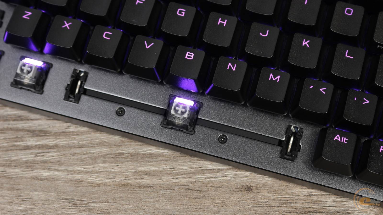 Під довгими клавішами встановлені Cherry-подібні plate-mount стабілізатори. Вони приємно здивували: скоби рівні, без перекосів, попередньо змащені — хід стабільний, без ратлінгу чи воблінгу. За потреби стабілізатори можна легко замінити на сторонні рішення, оскільки вони кріпляться до пластини на засувках.
