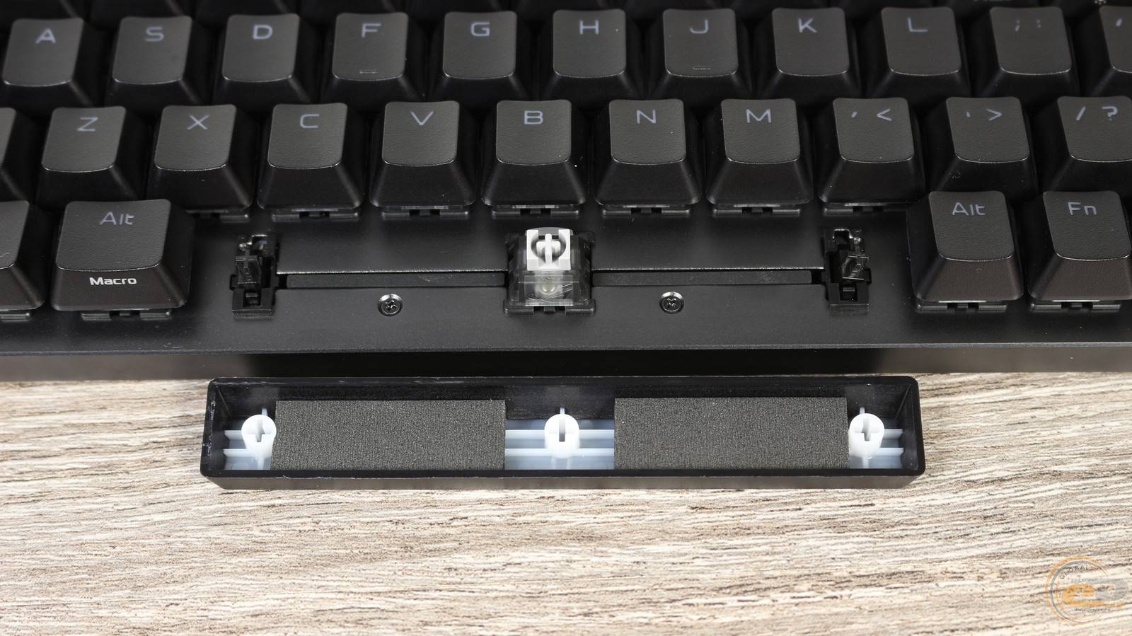 Крім того, по обидва боки від перемикача пробілу в отворі пластини розміщено дві м’які прокладки, які додатково стабілізують хід і зменшують паразитні резонанси. Усе це разом забезпечує щільний, глухий звук і приємне тактильне відчуття навіть на найбільшій клавіші.