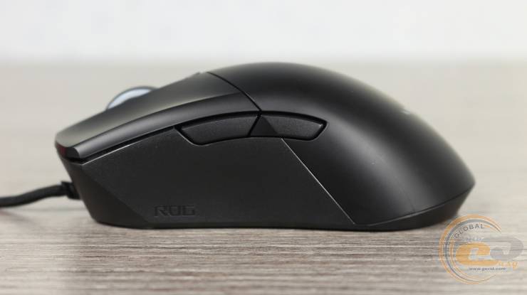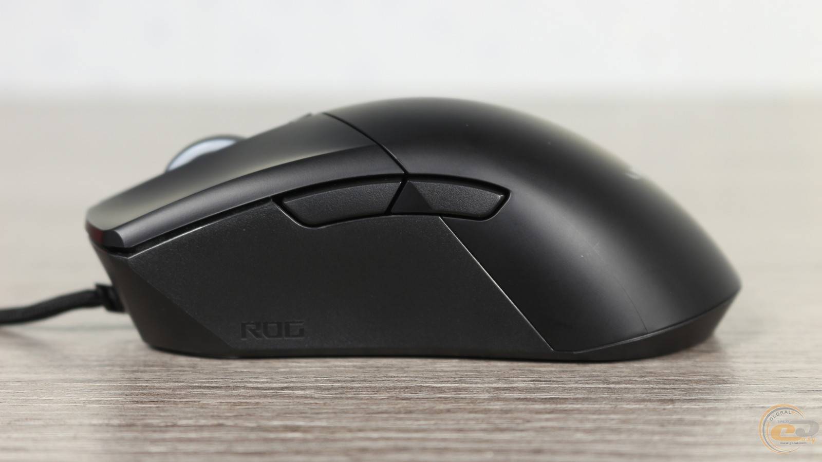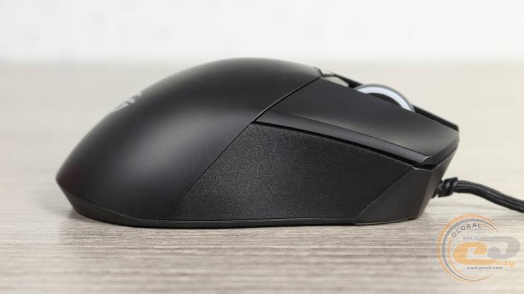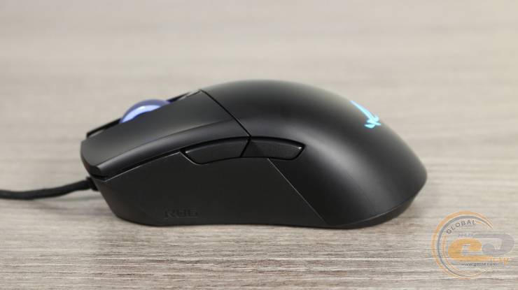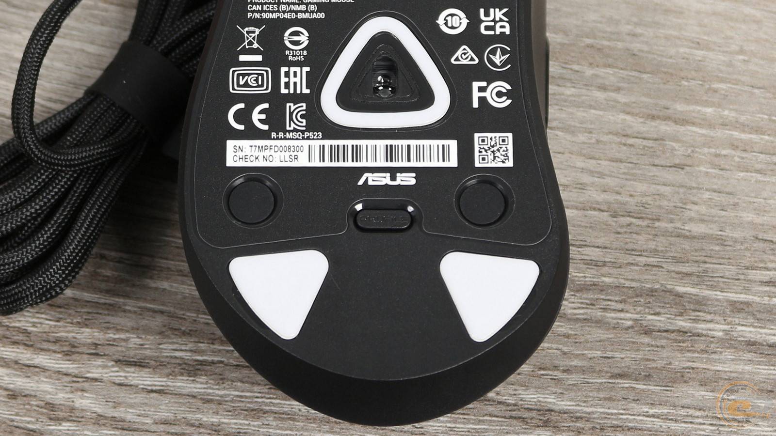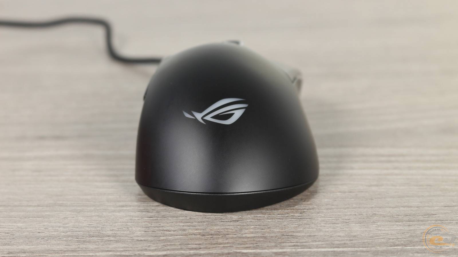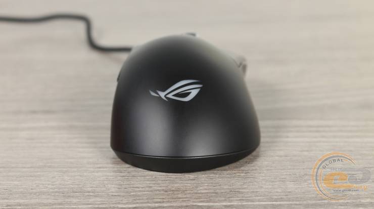 Ближче до задньої частини нанесено логотип ROG з RGB-підсвіткою, синхронізованою з колесом прокручування через ASUS Aura Sync.